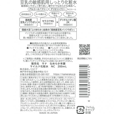 | 토키와 약품공업(TOKIWA PHARMACEUTICAL)의 나메라카혼포 두유 이소플라본 마일드 화장수 NC는 민감한 피부를 위해 특별히 개발된 저자극 보습 화장수입니다. 이 제품은 두유 이소플라본과 두유 발효액을 함유하여 피부를 건강하고 촉촉하게 가꿔줍니다. 또한, 에탄올과 향료를 포함하지 않은 순한 포뮬러로, 피부에 부담을 주지 않고 부드러운 사용감을 제공합니다. 피부에 빠르게 흡수되며 끈적임 없이 산뜻한 마무리를 선사하여 모든 피부 타입에 적합합니다. | |