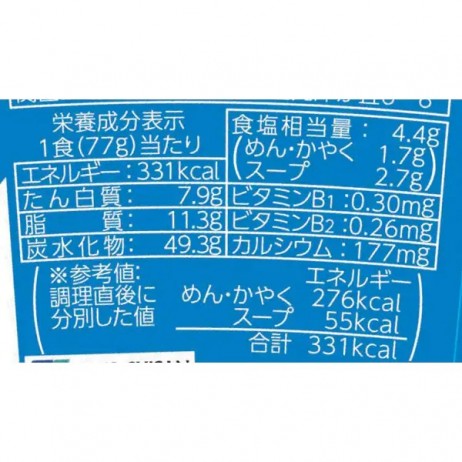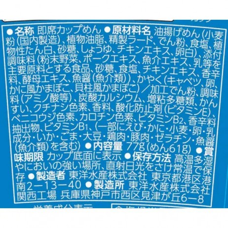 면: 소맥분, 식물성 유지, 정제 라드 등 스프: 시푸드 추출물, 유제품 가공품, 양파 분말, 소금, 설탕, 향신료 등 기타 부재료: 건조 해산물, 건조 야채 등 포함 알레르기 유발 성분: 밀(글루텐), 우유, 달걀, 새우, 대두, 닭고기, 돼지고기, 소고기 등. |